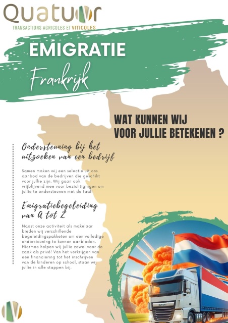 Quatuor is een bedrijf dat zich uitsluitend heeft gespecialiseerd in de overname van boerderijen en wijnbouw. Wij beheersen alle fasen van uw project, de problemen met betrekking tot dit type transactie, de verschillende betrokken acteurs, voorschriften, ... Het Quatuor-team bestaat uit een twintigtal experts uit de agrarische gemeenschap die er uitstekend van op de hoogte zijn. We spreken dezelfde taal als onze klanten, we weten hoe we de juiste vragen moeten stellen, op problemen moeten anticiperen, kansen moeten identificeren: dit vermogen om elk probleem volledig te begrijpen, stelt ons in staat onze klanten effectief te ondersteunen, ongeacht hun activiteit of type operatie . |